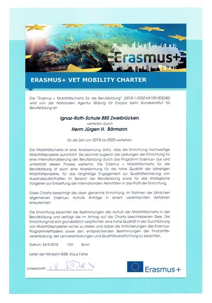 Im Frühjahr 2018 hat eine Arbeitsgruppe unter der Leitung von OStR Stefan Gurres die Mobiliätscharta beantragt. Dazu musste die Arbeit rund um das Erasmus+Projekt der Ignaz-Roth-Schule ausführlich beleuchtet werden. Im September kam nun die Belohnung für die Mühen. Unsere Schule wurde mit der Erasmus+ Mobilitätscharta ausgezeichnet. Damit wird die hohe Qualität unserer Mobilitätsprojekte offiziell bestätigt und unser langfristiges Engagement zur Qualitätssicherung von Auslandsaufenthalten anerkannt.
